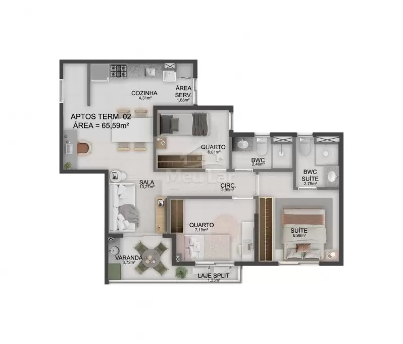 - Apartamentos de 3 quartos sendo 1 suíte (65,59 m²)
